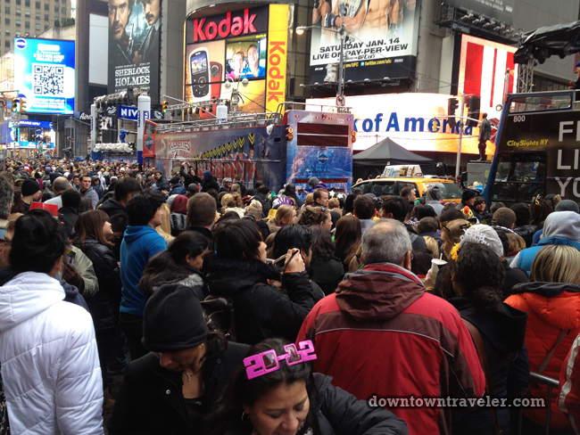 Thousands of people packed Times Square on Saturday afternoon hoping to score a plum spot for the New Year’s Eve ball drop. By 1 PM– 11 hours before the event– crowds already filled the sidewalk on 7th Avenue from 42nd through 47th streets.
