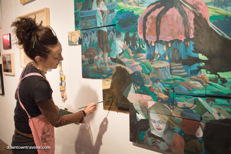It’s clear that the Internet is the new opiate for the masses, as dazed children ignore their environment in order to focus exclusively on their screens. (Plus, you can’t miss the giant mushroom at the center of the painting). This art work is ever-changing, as Nelson exclusively works on it during art fairs; she started creating the piece last summer at Governor’s Island and adds a panel or two every time she paints at an event.